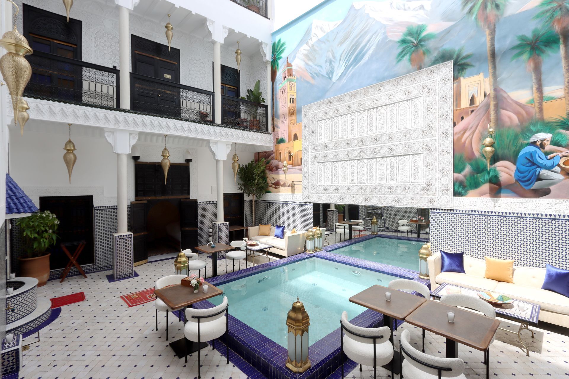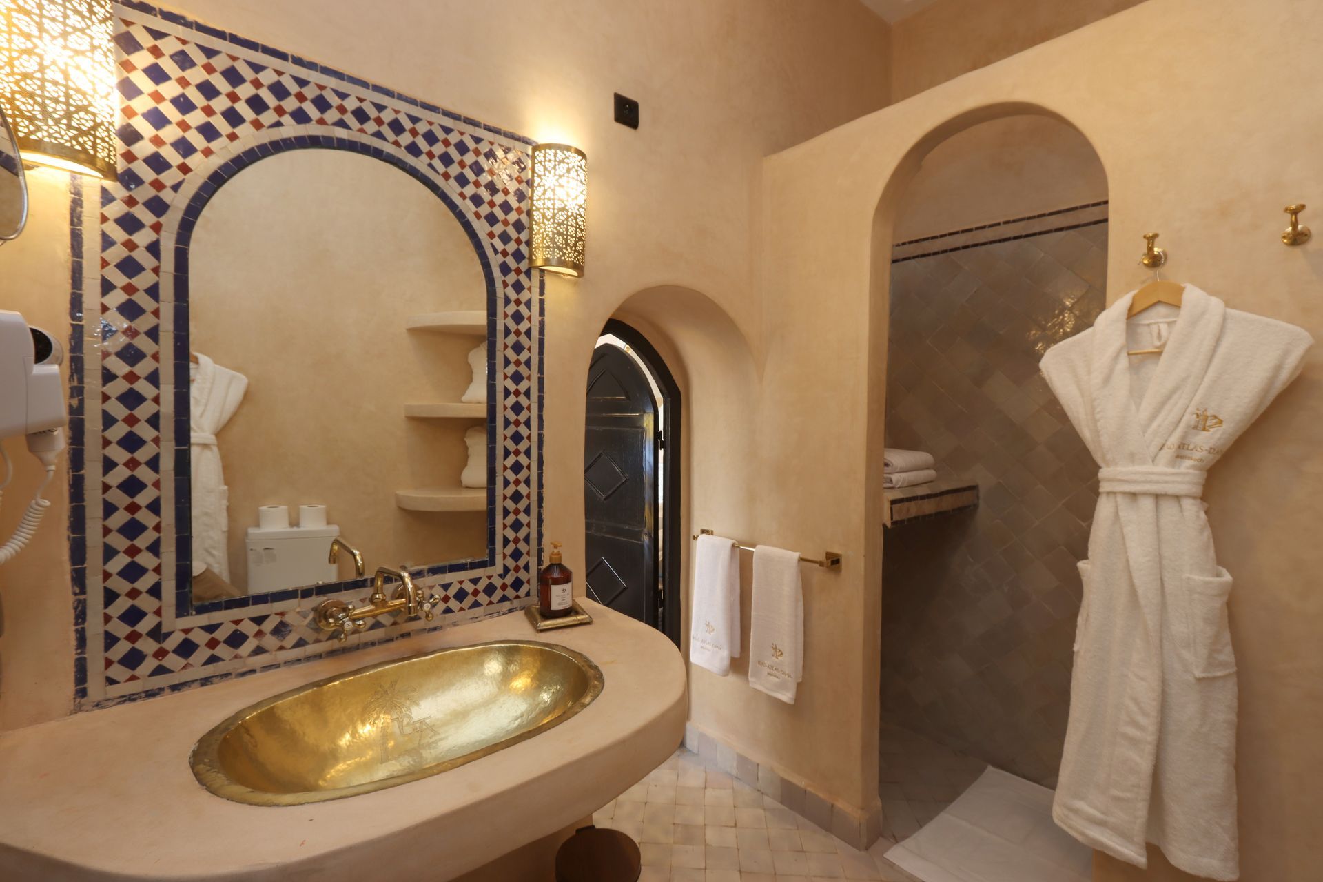 An Enchanted Interlude in the Heart of Marrakech nestled in the medina, at the heart of the authentic Riad Larousse neighborhood, Riad Atlas Majbar is a true haven of peace, recently restored in pure Moroccan tradition. It is one of the few Riads in Marrakech with direct car access and parking just 30 meters away. Its privileged location allows you to reach Dar El Bacha in only 2 minutes, the iconic Jemaa el-Fna square in less than 9 minutes, and the airport in 15 minutes, facilitating all your travels. Upon your arrival, let yourself be charmed by the lush patio, where a heated pool and a murmuring fountain invite you to relax. Want a suspended moment? Head to the panoramic terrace, where you can enjoy the view of the rooftops of the medina, the majestic Koutoubia, and the Atlas Mountains. Sit back on a comfortable sun lounger, enjoy a cocktail or a mint tea at the bar, and let the magic happen. Refined and Authentic Comfort The riad offers four suites and four rooms designed to combine elegance and well-being. An Unforgettable Sensory Experience Start your day with a Moroccan breakfast served on the terrace or by the pool, depending on your desires. At lunchtime or dinner, savor the delights of Moroccan cuisine, prepared on-site with fresh local ingredients. Unique Experiences in the Heart of Marrakech Want to discover Marrakech in a different way? The Riad Atlas Dama team is at your disposal to organize tailor-made experiences: electric bike rides, horse-drawn carriage tours, or carefully selected excursions to discover the city and its hidden treasures. Let yourself be seduced by the authenticity, charm, and elegance of Riad Atlas Mejbar. More than just a stay, a true immersion in the Moroccan art of living awaits you.